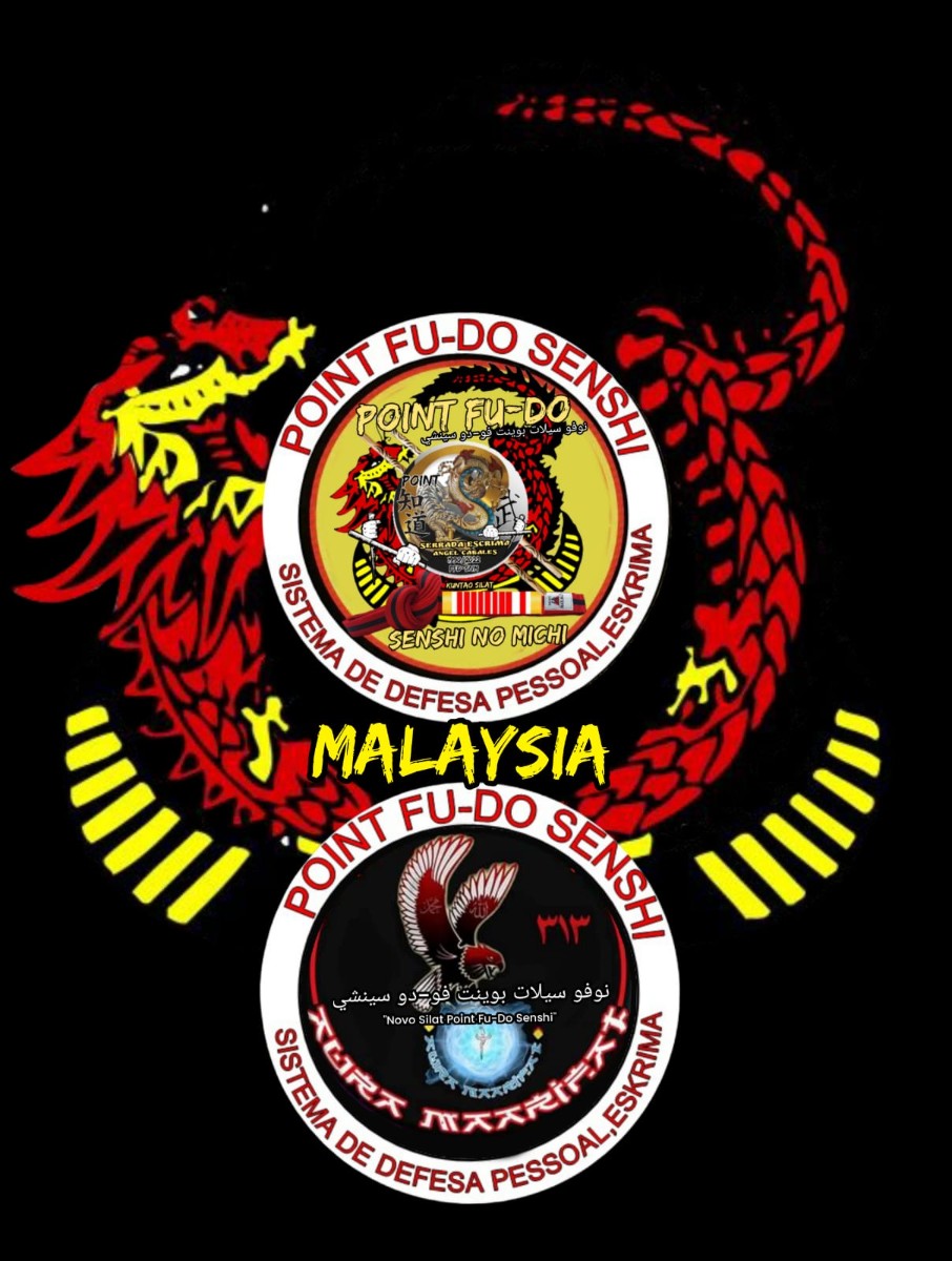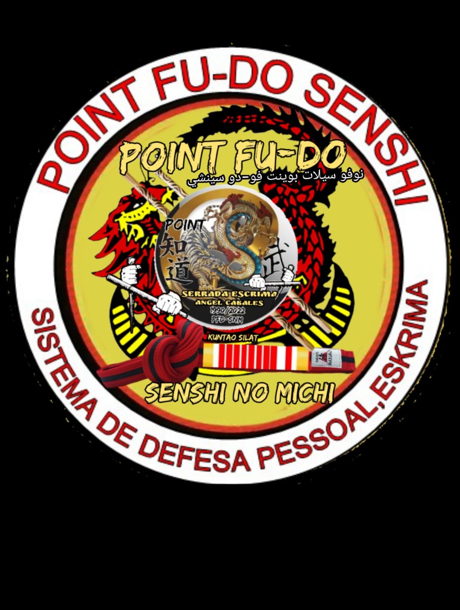O emblema circular interno reúne elementos de diferentes tradições marciais – Eskrima, Kuntao, Silat e outras influências – mostrando que o Point Fu-Do Senshi nasce do diálogo entre culturas e sistemas de combate.
